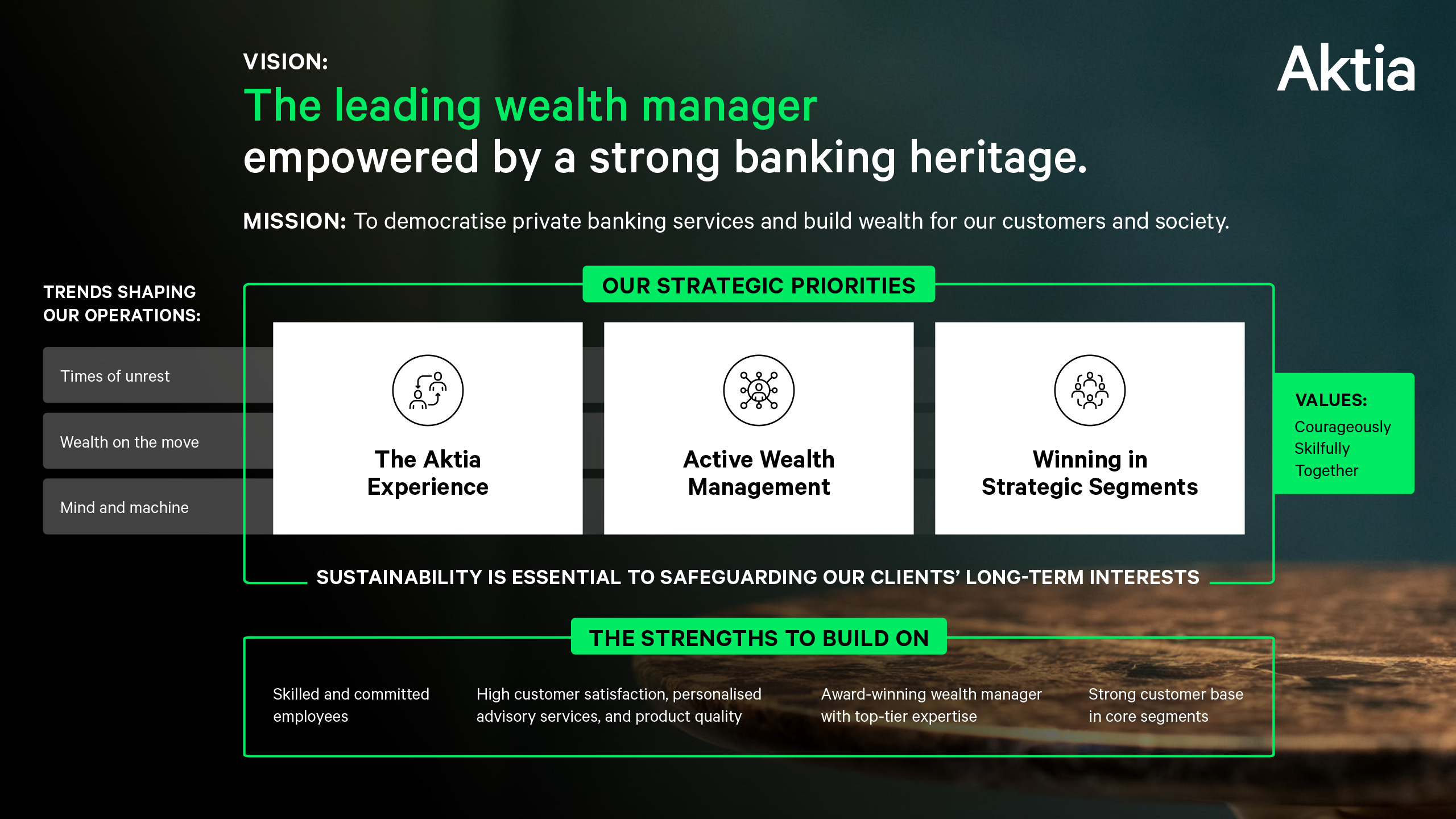 The core of Aktia's growth strategy is to accelerate our journey towards becoming a unique, leading wealth manager empowered by a strong banking heritage.