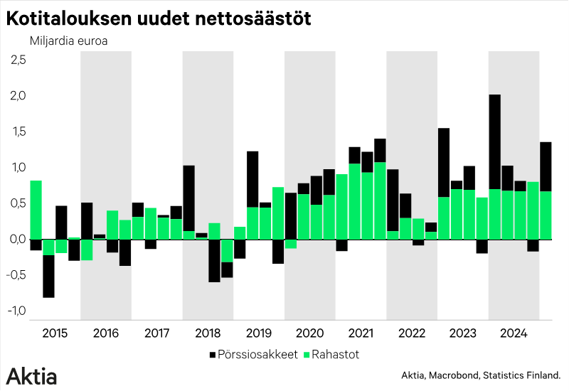 Markkinan epävarmuudesta huolimatta suomalaiset kotitaloudet olivat aktiivisia sijoitusmarkkinoilla vuoden ensimmäisellä vuosineljänneksellä. Pörssilistattujen osakkeiden nettohankinnat (myyntien ja ostojen erotus) olivat 692 miljoonaa euroa ja rahastojen 668 miljoonaa euroa. Edellisellä vuosineljänneksellä pörssiosakkeiden nettohankinnat olivat 168 miljoonaa euroa miinuksella.