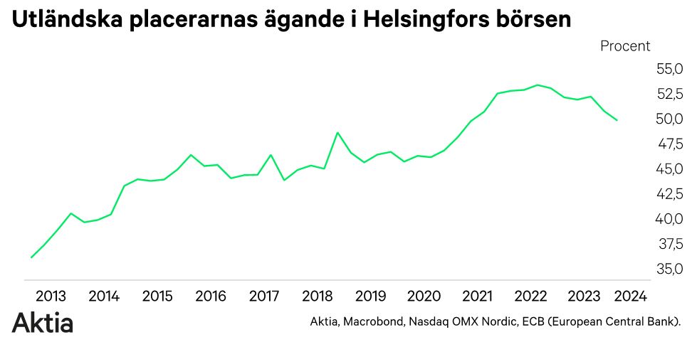 Andelen utländska portföljbörsplaceringar av hela Helsingforsbörsen ökade betydligt under 2021. Utvecklingen hos några stora finländska bolag har sannolikt bidragit till denna utveckling. Till exempel Nordeas aktier klarade sig bra 2021. Nordeas marknadsvärde står för mer än 10 procent av Helsingforsbörsens totala värde och dessutom är över 80 procent av Nordeas aktier i utländsk ägo.