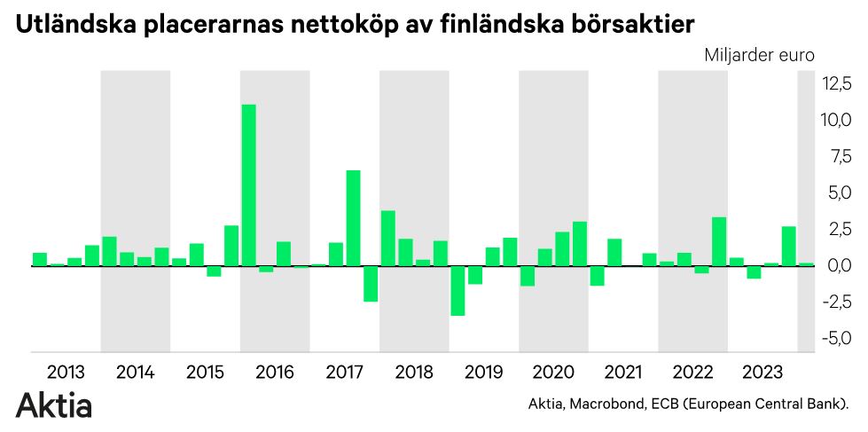 Just antalet nya portföljplaceringar har fortsatt att öka sedan kriget bröt ut. Under en del kvartal har förändringen varit negativ men i regel har den varit positiv, och om man räknar samman förändringen för alla kvartal har utländska aktörer köpt fler finländska börsaktier netto än de har sålt dem. Den långa östgränsen och Rysslands anfall mot Ukraina har alltså inte skrämt bort de utländska placerarna från Helsingforsbörsen.